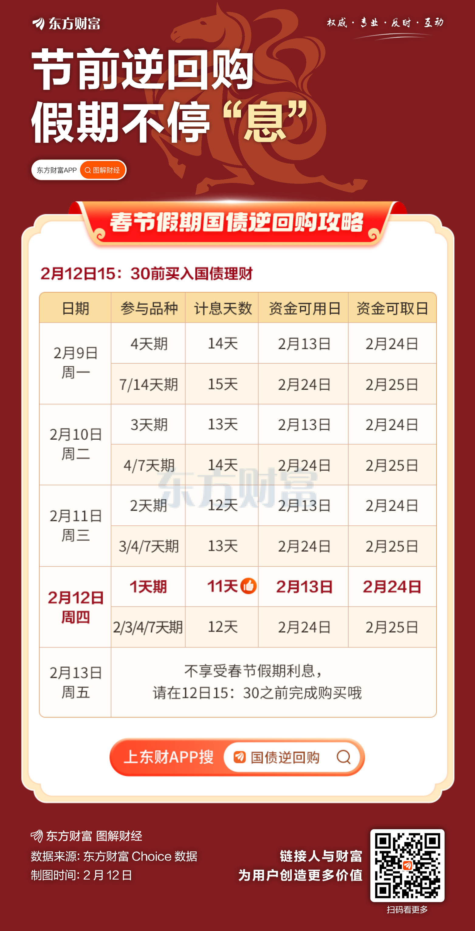 2月12日(周四)是春节前国债逆回购的最佳出手日,当天投资1天期逆回购(沪市为GC001,代码204001;深市为R-001,代码131810),资金可享跨春节长假计息,计息天数为11天,并且资金在第二天(2月13日)可用,至节后2月24日资金可取。